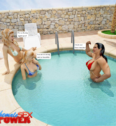 This hot muscle tranny has a special surprise for two curious bisexual > chicks who decide to join her in a small outdoor pool. Just when they start thinking about a lesbian three-way her big fully erect cock pops from under the water and the bitches are so shocked they just can't resist the temptation to suck it. A beautiful athletic shemale fucking two naughty babes in a pool and on a deck char - you absolutely gotta check out this stunning scene from Mighty Shemales! |